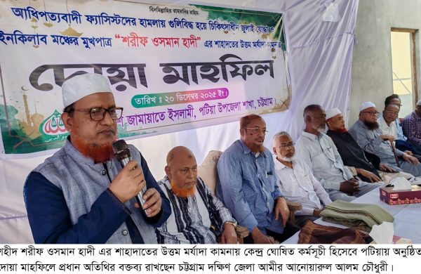 মানব সময় ডেস্ক : কেন্দ্র ঘোষিত কর্মসূচী হিসেবে আজ (২০ ডিসেম্বর) সারাদেশে দোয়া মাহফিল অনুষ্ঠিত হয়। আধিপত্যবাদী ফ্যাসিস্টদের হামলায় গুলিবিদ্ধ হয়ে চিকিৎসাধীন জুলাই যোদ্ধা ও ইনকিলাব মঞ্চের মুখপাত্র শরীফ ওসমান